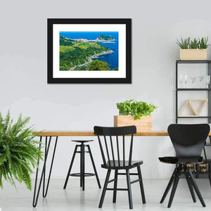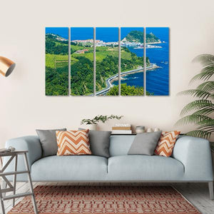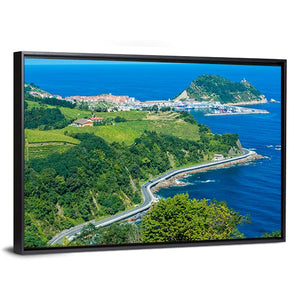 This canvas features a high-angle view of a picturesque coastal town in the Basque Country. With serene blues and greens, it captures a winding road hugging the coastline and small buildings nestled amongst green hills, creating a realistic and calming atmosphere.