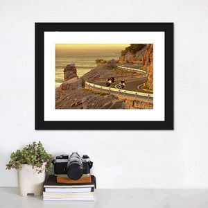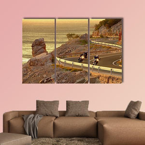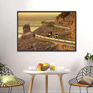 Coast Road Croatia Canvas Art shows two motorcycles on a winding coastal road in Croatia, with ocean and cliffs in view. The realistic scene uses warm orange and cool blue tones and a sense of motion to create an adventurous, scenic mood. It fits well with modern room decor such as living rooms or hallways.