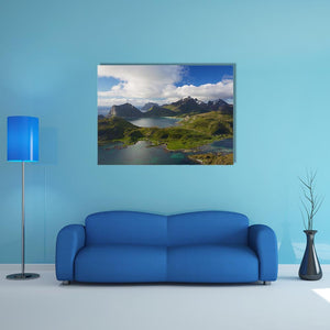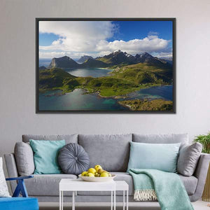 Experience the serene beauty of Norway's Lofoten Islands with this captivating canvas art. Featuring majestic mountains, crystal-clear waters, and lush green hills, it brings a tranquil feel to any space.
