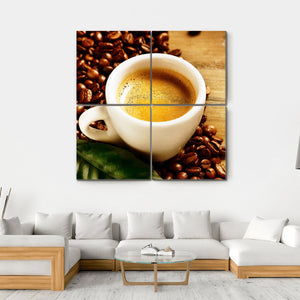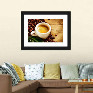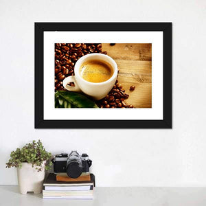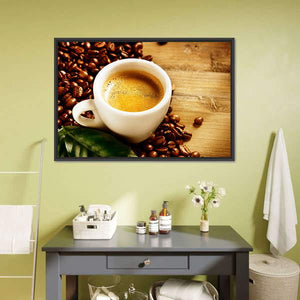 This warm and inviting canvas features a close-up of a cup of coffee, complete with creamy froth and surrounded by coffee beans and leaves. Perfect for coffee lovers or anyone looking to create a rich, aromatic atmosphere in their space.