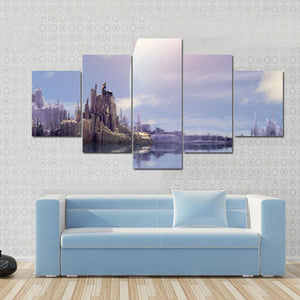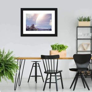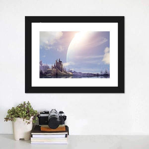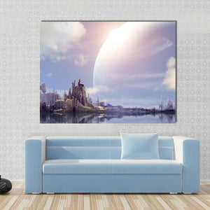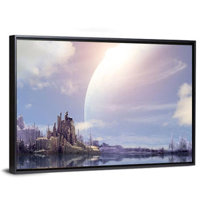 Explore a mystical alien world with our Fantasy Planet Canvas Wall Art. This striking piece features a large luminous planet dominating a surreal landscape that includes a futuristic city and tranquil waters reflecting the vibrant blues and purples of the scene.