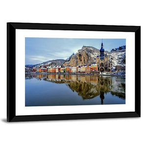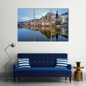 Collegiate Church & River Canvas Art depicts a realistic riverfront town centered on a collegiate church and nearby fortress beneath a snowy mountain slope, with buildings reflected in the water. Rendered in cool blues, soft yellows, white and grey, the scene feels serene, picturesque, and grand — a calm focal piece for modern room decor.