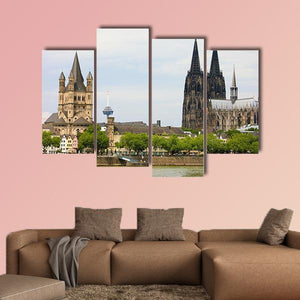 Cologne Cathedral Canvas Wall Art shows the cathedral and nearby city skyline, with two prominent churches—one with tall spires—seen across a calm river lined with trees. Rendered in a realistic style and composed using the rule of thirds, the print uses brown, green, grey, blue and white tones to create a historic, grand and serene mood. It fits well in living rooms or studies with modern or traditional decor.