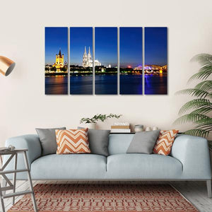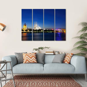 Experience the enchanting skyline of Cologne with this captivating canvas art. The illuminated cathedral and bridge shimmer against a deep blue night sky, reflecting beautifully on the river. This photorealistic piece adds a touch of grandeur to any space.