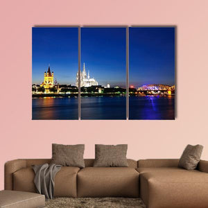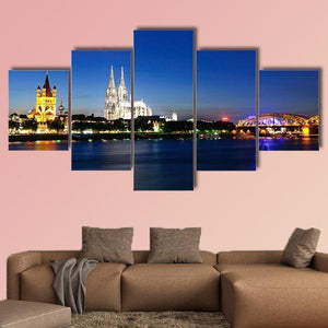 Cologne City At Night shows the cathedral, river, bridge and city skyline in a wide, realistic night scene. Glowing lights on buildings and the bridge cast warm yellow and orange highlights across deep blue water, with clear reflections that convey a vibrant, illuminated evening mood. Great for modern living rooms that need a bold cityscape focal point.