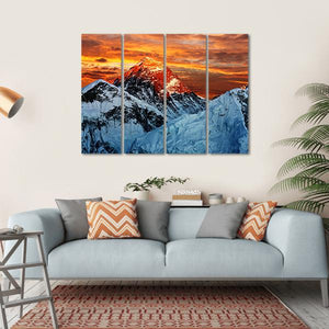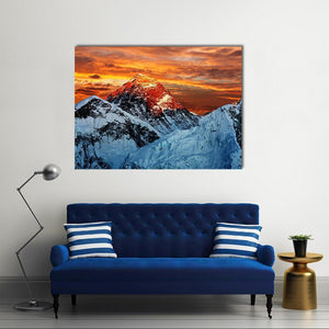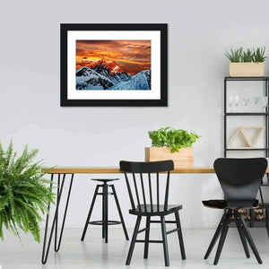 This striking canvas art captures the majestic peak of Everest, framed by dramatic clouds and shimmering sunlight. The realistic portrayal brings the awe-inspiring nature of Nepal to your space, making it a perfect focal point for any room.