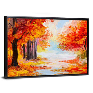 This canvas features a vibrant display of autumn trees, blending warm hues of red, orange, and yellow with serene hints of blue. The impressionistic style and thick brushstrokes create a sense of depth, making it a beautiful addition to your home decor.