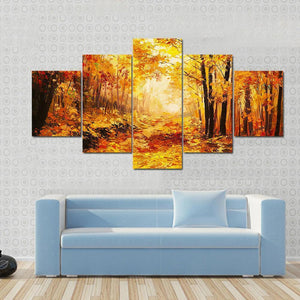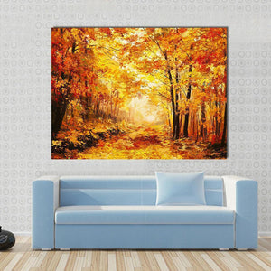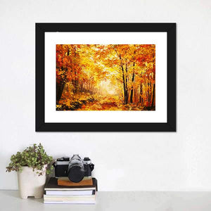 This artwork captures a serene forest path adorned with autumn leaves and dappled sunlight. Its warm palette of yellows, oranges, and browns creates an inviting atmosphere.