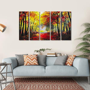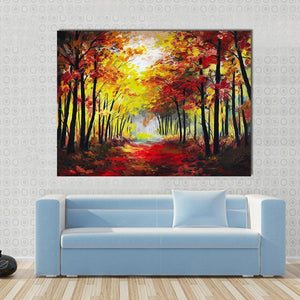 This canvas artwork captures a serene forest path surrounded by vibrant autumn foliage. With rich hues of red, yellow, and orange, it creates a warm and inviting atmosphere perfect for any room.