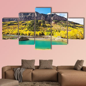 Autumn In Colorado places dramatic mountain peaks, a calm lake, and vibrant yellow autumn trees in a serene, colorful composition. Depth and natural framing—including a rock formation in the water—give the scene a majestic, grounded feel. The landscape works well in nature‑inspired or rustic rooms as a calm focal piece.