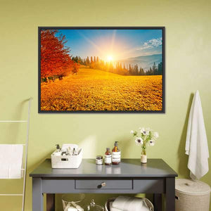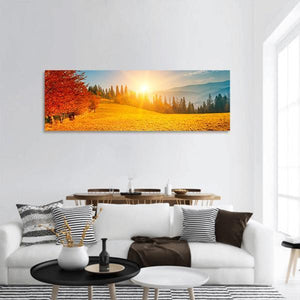 This Autumn Landscape Ukraine panoramic canvas shows a realistic mountain range with autumn trees and a sun-setting glow. Warm oranges and yellows meet cool blues and greens for a peaceful, serene sunburst effect. A calm focal piece that suits living rooms or entryways with modern or nature-inspired décor.