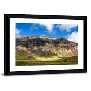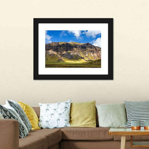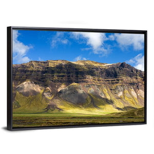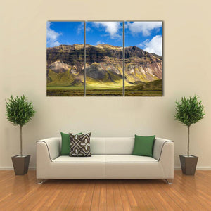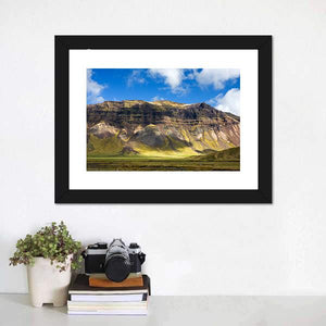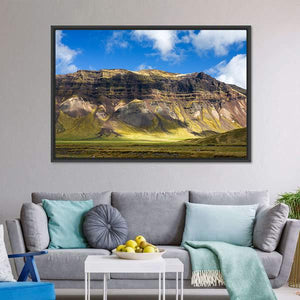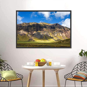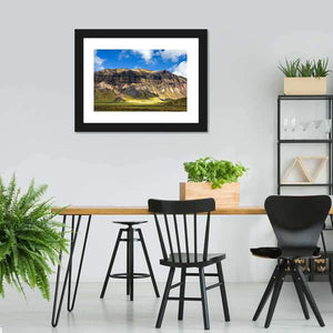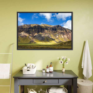This canvas shows a wide mountain landscape with layered slopes, a sunlit valley floor, and a sky filled with clouds. The realistic scene feels serene and majestic and pairs well with modern or nature-focused room decor.