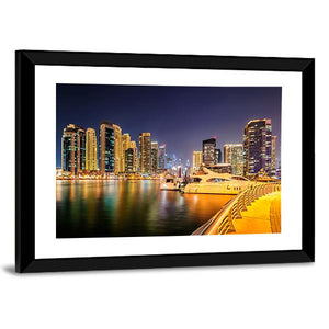 This artwork features a vibrant city skyline of Dubai, capturing the lively atmosphere of the waterfront at night. With rich hues of blue, yellow, and black, it reflects the beautiful city lights and water reflections, creating an urban vibe perfect for modern decor.