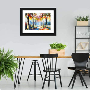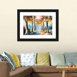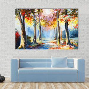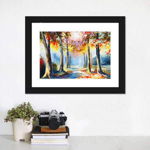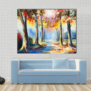 This canvas art features a serene forest path framed by autumn trees, showcasing warm hues of yellow, red, blue, and brown. Its impressionistic style captures sunlight filtering through the leaves, creating a vibrant and inviting atmosphere.