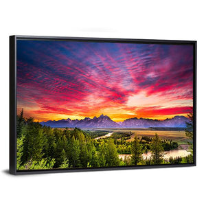 This canvas wall art captures a serene sunset over the Snake River, framed by majestic mountains and lush forests. The dramatic palette of red, orange, and purple evokes a sense of tranquility and wonder, making it a striking addition to your home décor.