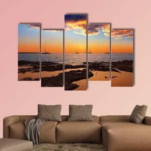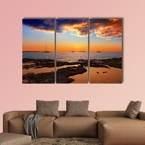 A photo-realistic view of an Ibiza sunset, showing several sailboats on calm sea and a rocky shoreline with tidal pools. Warm orange and blue tones and dramatic clouds give the scene a serene, peaceful mood that fits coastal and modern room decor.