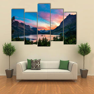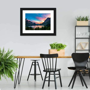 Capture the serene beauty of St. Mary Lake with this stunning landscape artwork. The artwork features a sunset sky filled with vibrant hues of blue, pink, and orange, reflecting beautifully on the water below, framed by majestic pine trees.