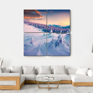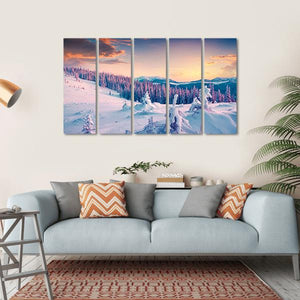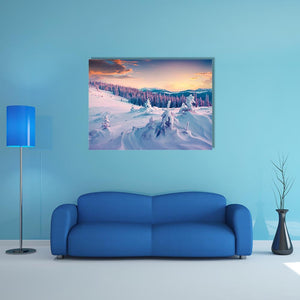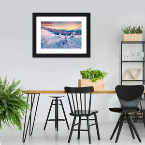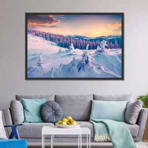 Bring the serene beauty of a colorful winter sunrise into your space with this canvas art featuring majestic snowy mountains and pine trees. The tranquil scene captured in soft pinks, blues, and rich oranges evokes a peaceful winter atmosphere, perfect for nature lovers.