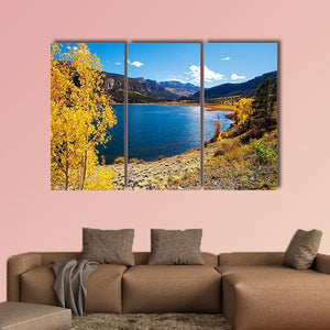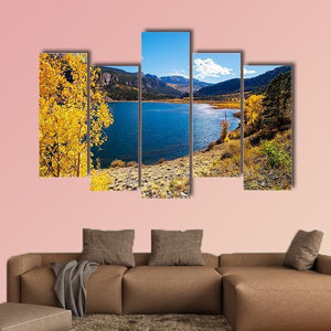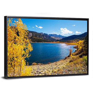 Lake in Colorado captures a serene, vibrant autumn scene with deep blue water, bright yellow foliage and a distant mountain range. The realistic landscape fits modern homes and nature-themed rooms, bringing a calm, autumnal mood to living spaces.