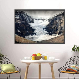 Columbia Icefield Glacier Canvas Wall Art presents a photorealistic, wide aerial view of a glacier and rugged mountain slopes. White and gray ice, rocky browns and deep blacks sit beneath an overcast sky, with a visible icefall that adds depth and scale. The overall feeling is vast, cold and serene, well suited to modern home and room decor.