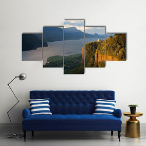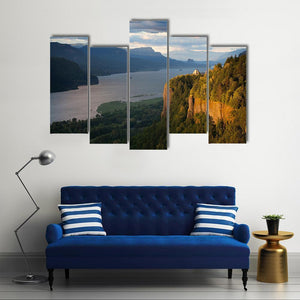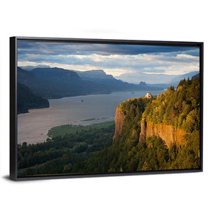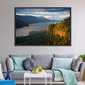 This landscape artwork beautifully captures the Columbia River and its surrounding cliffs and mountains. The serene blues and greens create an expansive atmosphere, making it a striking addition to any room.