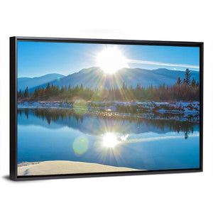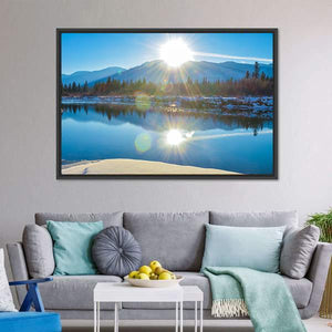 A panoramic nature photograph of the Columbia River in Canada, with sunlit mountains, snow-dusted trees, and a calm river reflecting a sunburst. Its cool blues, whites, greens, and browns create a serene, bright mood that fits modern and nature-focused rooms as a peaceful focal point.