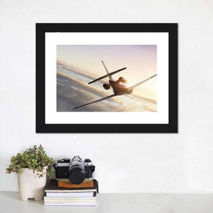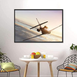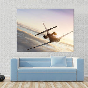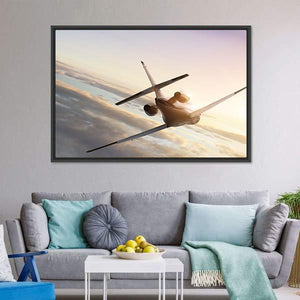 This canvas artwork captures a private jet soaring through a sunset sky, evoking feelings of aspiration and peace. With beautiful hues of blue, orange, and purple, it's a striking addition to any space.