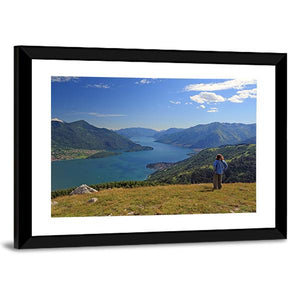 A lone figure overlooks Como Lake with mountains rising beyond and a distant lakeside village. The realistic landscape uses blues, greens, browns, and whites to create a serene, contemplative sense of depth. Suits modern or nature-inspired rooms as a calm focal piece.