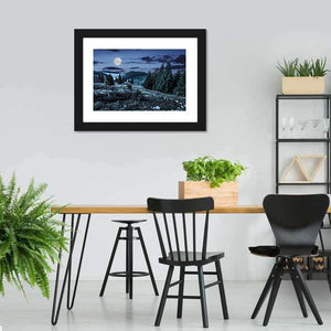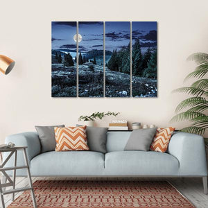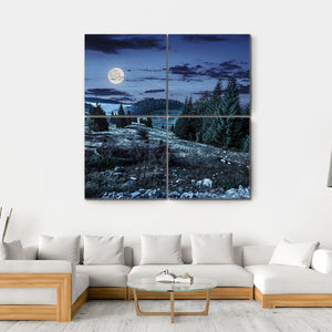 This canvas art portrays a tranquil moonlit forest scene, featuring pine trees against a serene night sky. The deep blues and greens create a mysterious atmosphere perfect for bringing a touch of nature into your space.