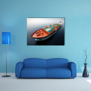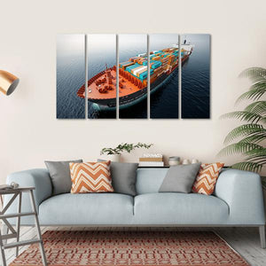 This striking canvas artwork captures a container ship navigating through tranquil ocean waters, viewed from a high angle. The serene palette of blue, orange, and white evokes a peaceful atmosphere, making it a perfect addition to modern decor.