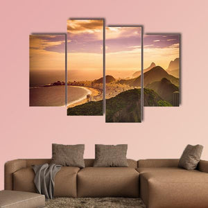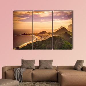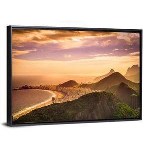 Copacabana Beach At Dusk shows a realistic coastal scene of Copacabana with a curving coastline, lush green mountainside, and a sunset sky in orange and purple hues. The aerial perspective and gentle depth of field create a serene, majestic mood that fits modern living rooms or bedrooms.