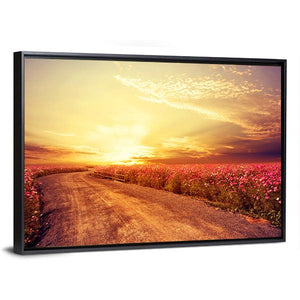 Pink cosmos bloom across a wide flower field at sunset, with a dirt road leading through the scene. Golden-pink, orange and red tones and clouds illuminated by the sunset create a warm, peaceful, vintage mood suitable for living rooms or bedrooms.