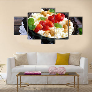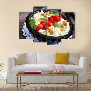 A close-up food photograph featuring cheese with strawberries and nuts, with rice pudding, cashews and a sprig of mint. The realistic image feels fresh and sweet, using white, red, green and brown tones and a black faceted bowl on a white doily. A natural fit for kitchens, dining areas or restaurant walls.
