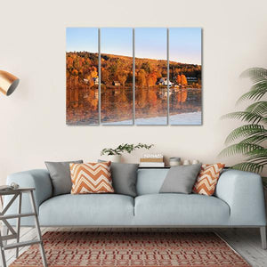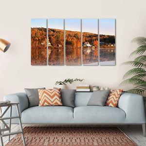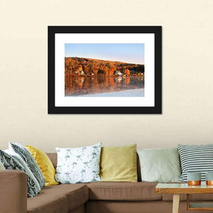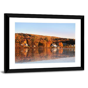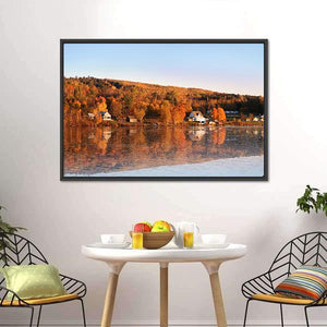 This captivating canvas art showcases a serene view of a lake surrounded by vibrant autumn trees and charming houses along the shore. With warm hues of orange and yellow reflecting in calm waters under a clear blue sky, it brings a peaceful ambiance to any space.