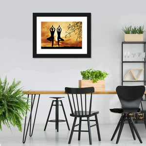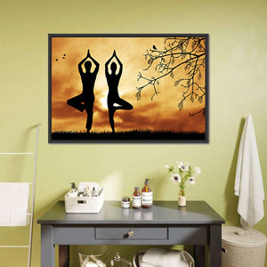 This canvas art features a serene sunset scene depicting two individuals gracefully in yoga poses, surrounded by silhouetted trees and birds in flight. The calming palette of orange, black, and brown adds a peaceful touch, making it a great addition to any fitness or nature-inspired décor.