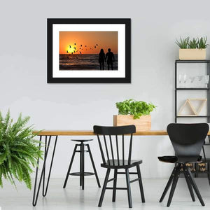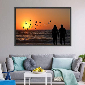Couple On Beach Panoramic Canvas depicts two silhouetted figures holding hands against a warm orange sunset, with a flock of birds and gentle ocean waves. The minimalist, modern composition feels romantic, serene, and peaceful. It works well in modern or minimalist living rooms and bedrooms as a calm coastal accent.