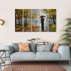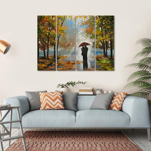 This canvas art captures a couple sharing an umbrella under autumn trees on a rainy day. With silhouettes amid a palette of orange, yellow, and brown, it creates a romantic and peaceful atmosphere, making it a beautiful addition to your wall decor.