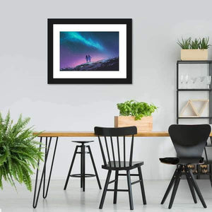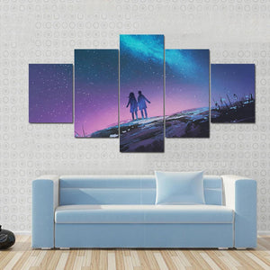 This canvas art beautifully depicts a couple gazing at a starry sky filled with colorful nebulae. The romantic scene combines teal, purple, and blue tones, inviting a sense of wonder and serenity to your space.