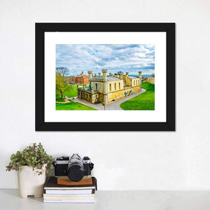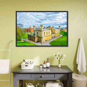 This panoramic canvas shows Lincoln Castle’s stone walls, turrets, and grassy lawns bathed in warm sunlight. The wide-angle composition and a palette of yellow, green, blue, and white create a sunny, calm atmosphere that complements modern room decor.