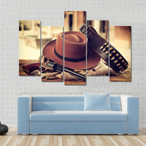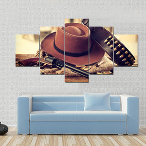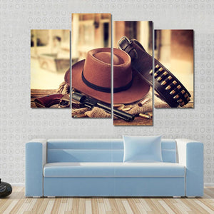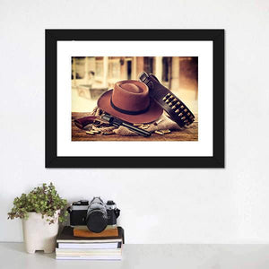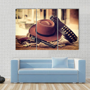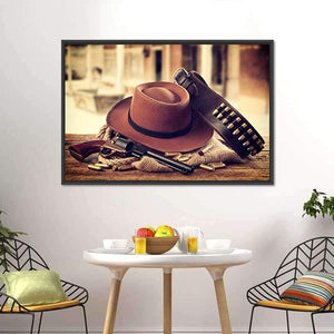 This canvas features a close-up still life of a cowboy hat and revolver set against a rustic backdrop. The brown and gold tones evoke a vintage western feel, making it a striking addition to any wall decor.