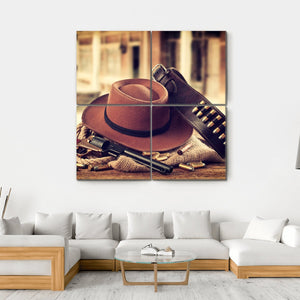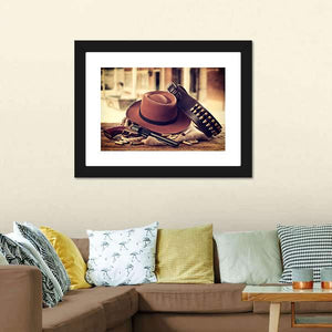 This striking canvas art features a cowboy hat, revolver, and scattered bullets, evoking a nostalgic western charm. The warm palette of browns, golds, and tans gives it a vintage and rustic vibe, perfect for enhancing your room's decor.