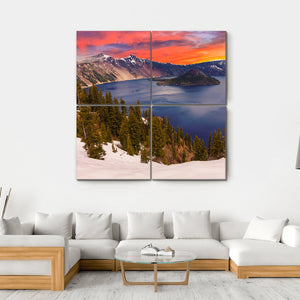 This canvas art captures the serene beauty of Crater Lake, featuring a dramatic sunset with fiery hues reflecting off its waters. Snow-covered mountains and dense evergreen forests frame the lake, creating a majestic landscape that invites peaceful contemplation.