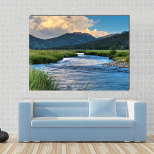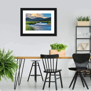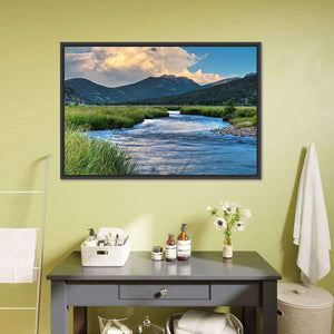 This landscape artwork captures a tranquil river flowing towards the viewer, framed by majestic mountains and puffy clouds. Its serene palette of blues and greens brings a sense of peace to any space.