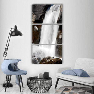 A close-up view of a white waterfall spilling over dark, wet rocks, captured with a long-exposure effect that softens the flowing water. The image balances a serene yet powerful, natural mood with a palette of white, grey, brown and black. It suits contemporary or nature-inspired rooms that welcome calm, motion-rich artwork.