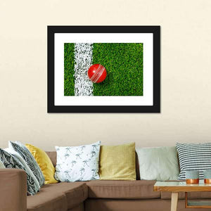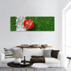 A close-up canvas print of a red cricket ball on green grass with a white line, set in a sporty, vibrant mood. The rule-of-thirds composition highlights the ball’s stitching and the detailed grass texture for a focused, modern look that fits modern living rooms or sports-themed spaces.