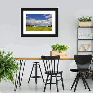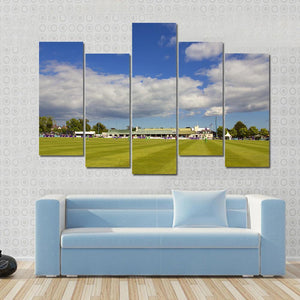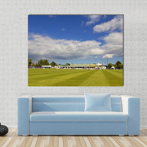 This vibrant canvas art captures a lively cricket pitch under a bright sky. Featuring a realistic portrayal of the stadium and clouds, it brings a sense of activity and cheer to your space.