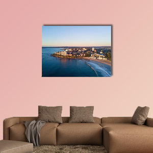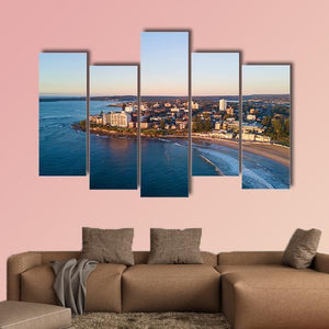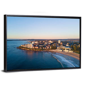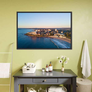 Cronulla Beach Canvas Wall Art presents an aerial, wide shot of the beach and coastal city skyline with waves crashing along the shore. The photorealistic image uses blue, green, white and tan tones to evoke a calm, sunny, serene atmosphere. It works well in modern coastal or living room decor that favors nature-inspired wall art.