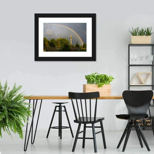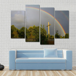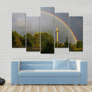 Featuring a serene landscape, this canvas art showcases a double rainbow arching over a rustic wooden cross and fence amidst tranquil trees. Its hopeful vibe makes it a charming addition to any room.