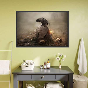 This canvas art features a mysterious crow perched on a gravestone, surrounded by a foggy backdrop. The dark palette of browns and greys creates a spooky, gothic atmosphere, perfect for adding an eerie touch to your space.