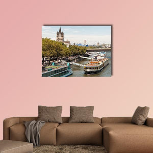 Cruise Ships In Cologne Canvas Wall Art shows cruise ships and riverside architecture in Cologne in a lively, sunny scene. The realistic print uses blue, green, brown and beige tones to create depth around boats, trees, a bridge and a towered building, making it a scenic accent for house wall decor and modern room decor.